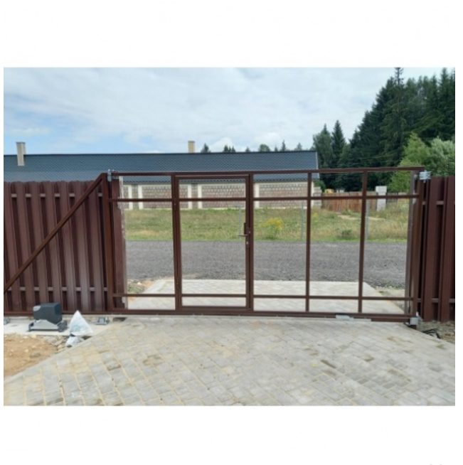 Откатные ворота со встроенной калиткой изготовлены из прочной долговечной стали и окрашены эмалью 3в1 с высокой устойчивостью к коррозии. Без учета противовеса, ширина ворот составляет 4500 мм., а их высота 2000 мм.